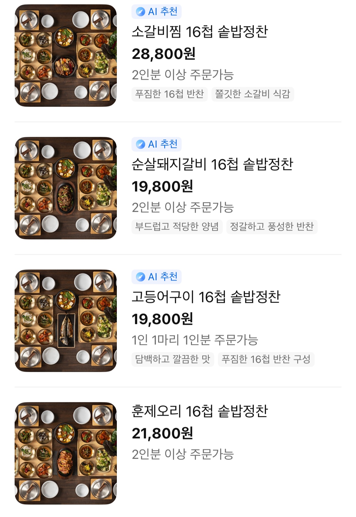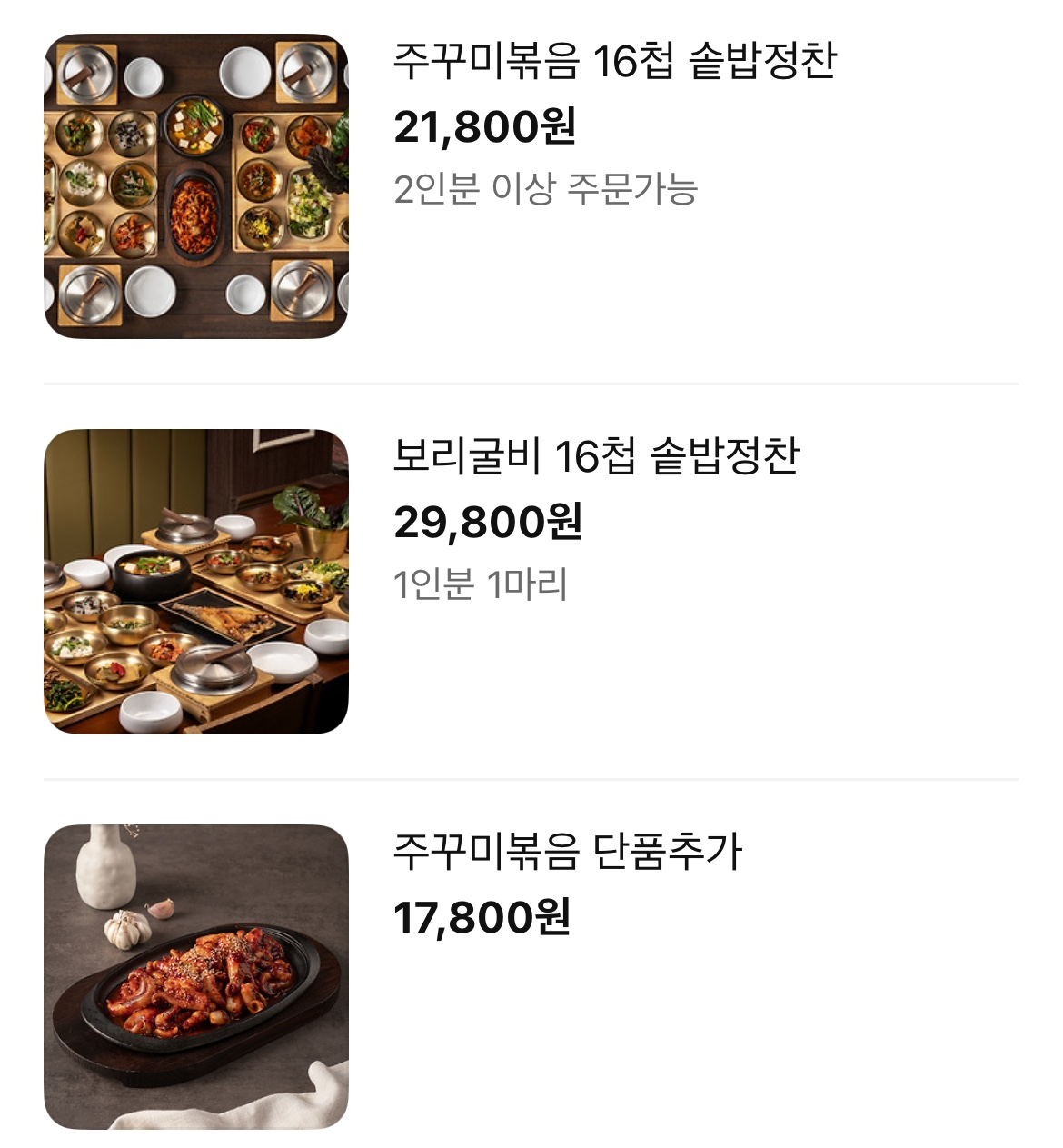 아래 메뉴중에 저희는 고등어구이,훈제오리,주꾸미볶음(2인분 이상 주문가능) 이렇게 시켜서 먹었어요.